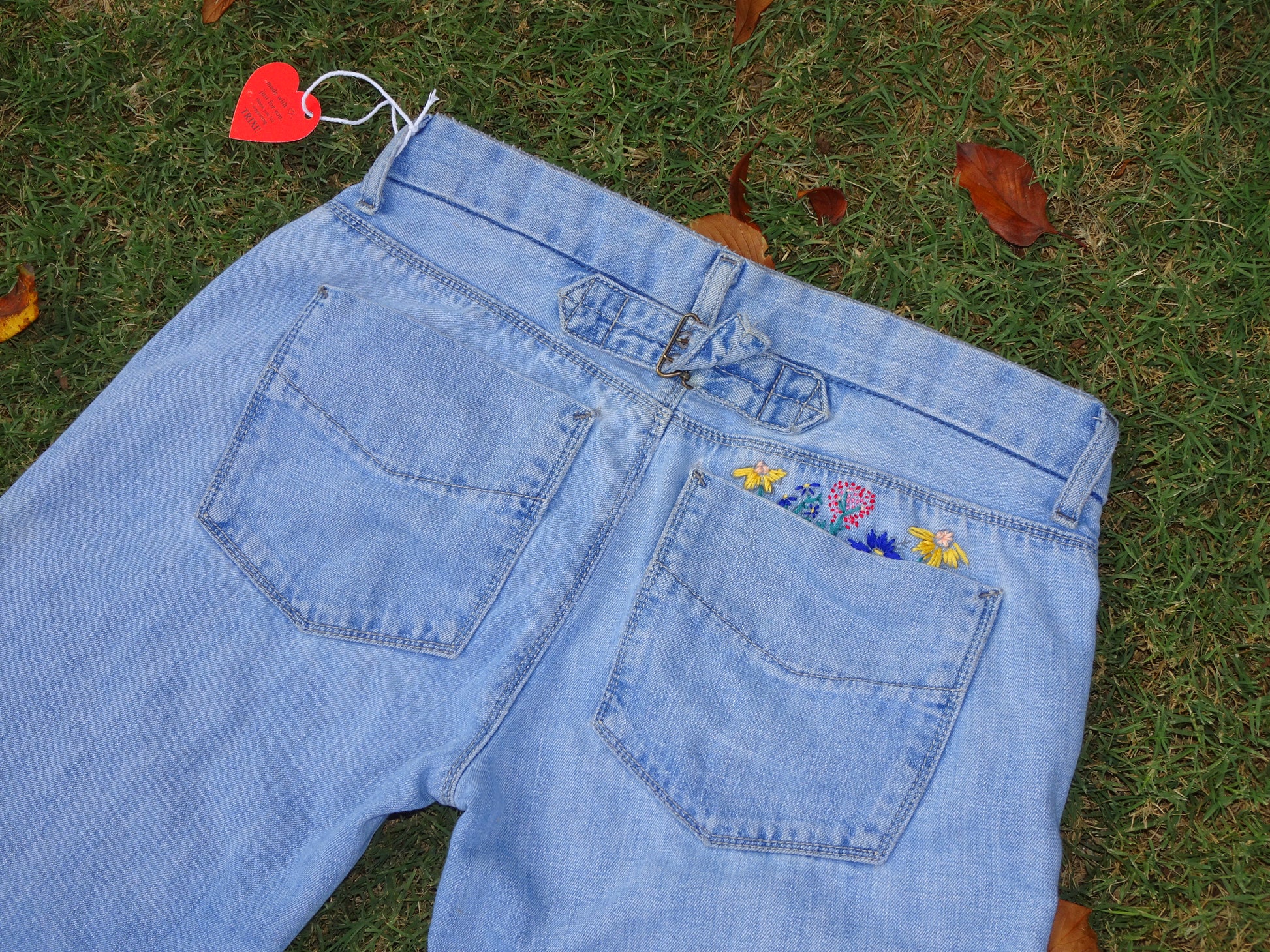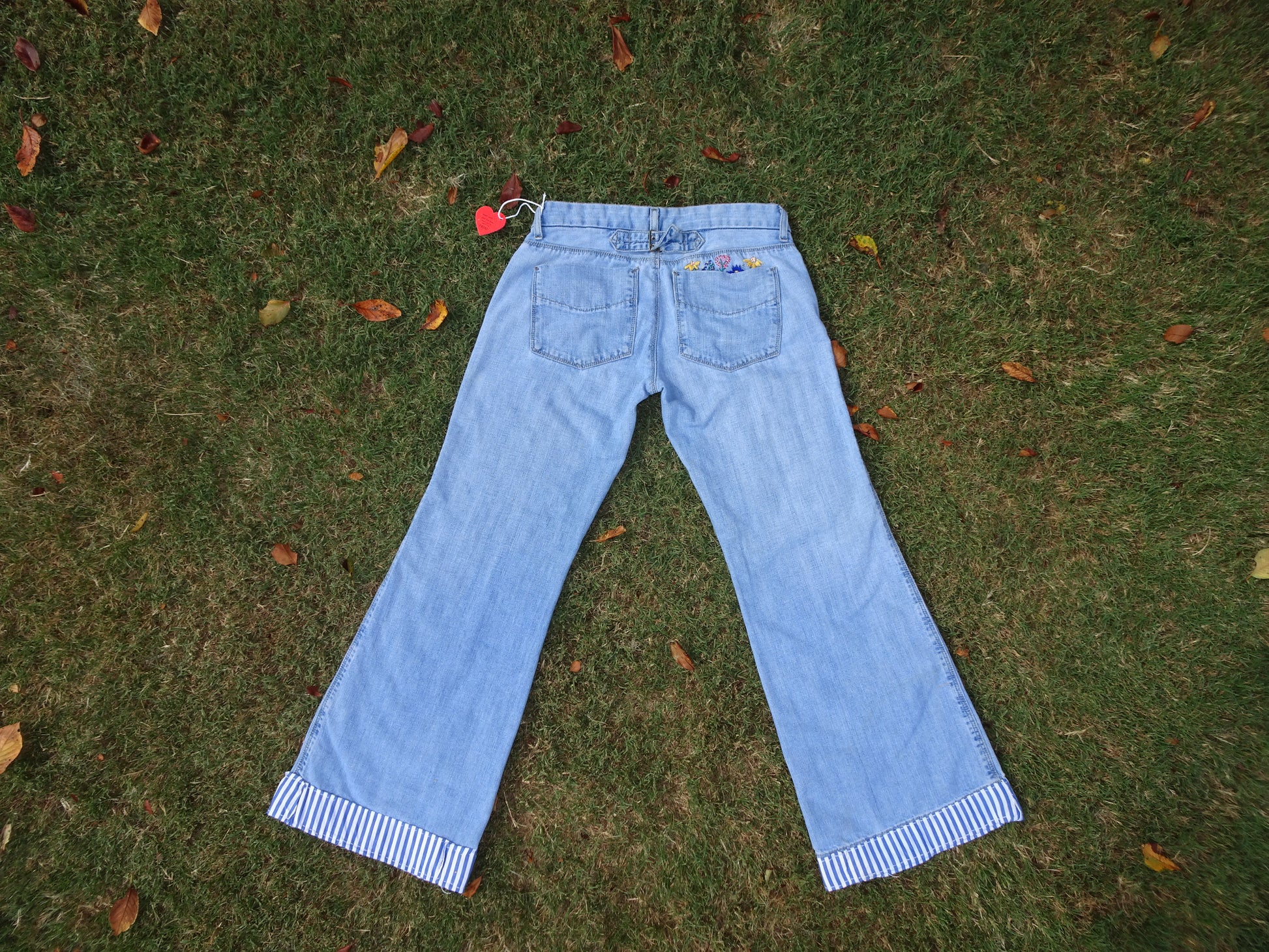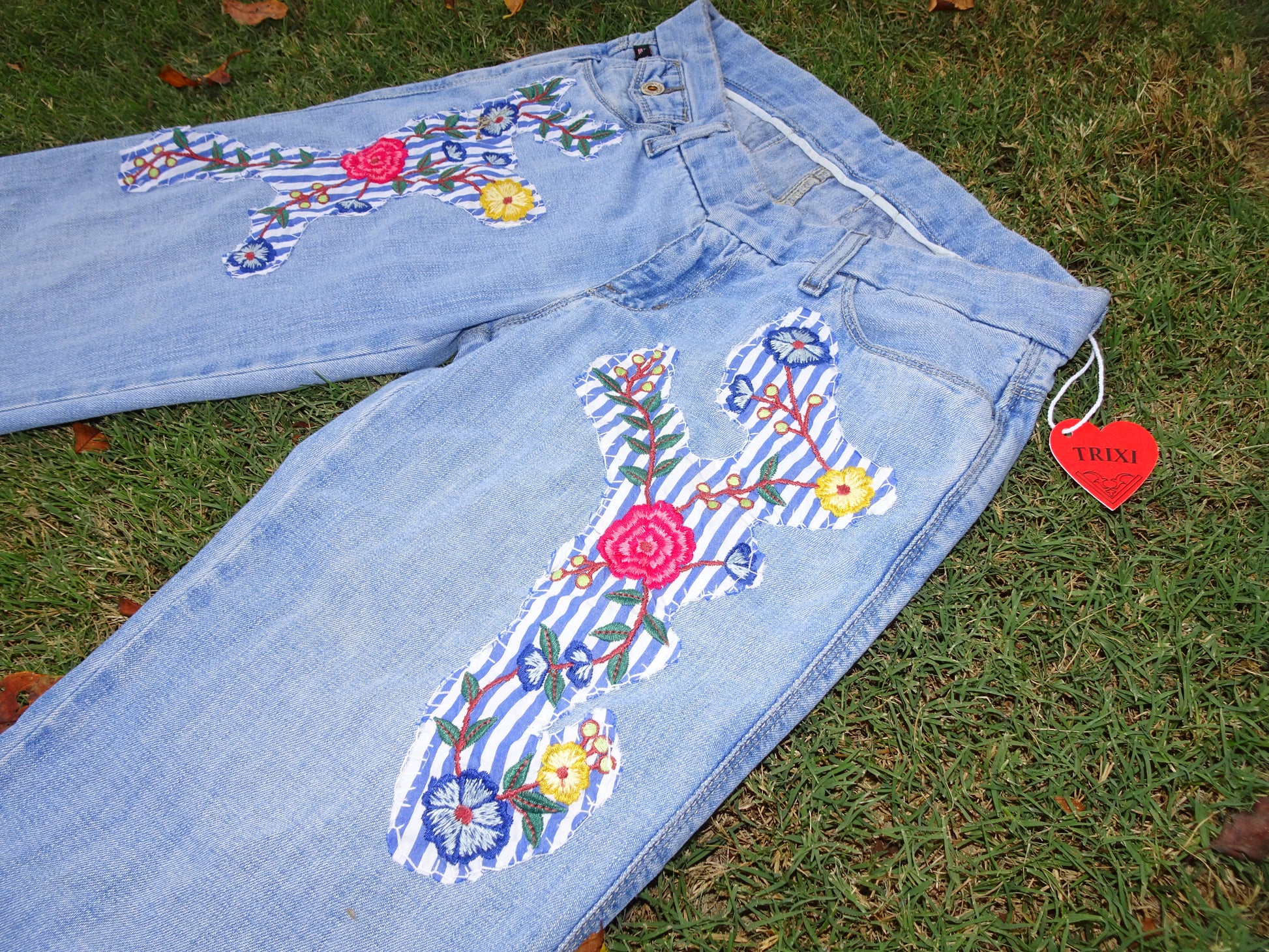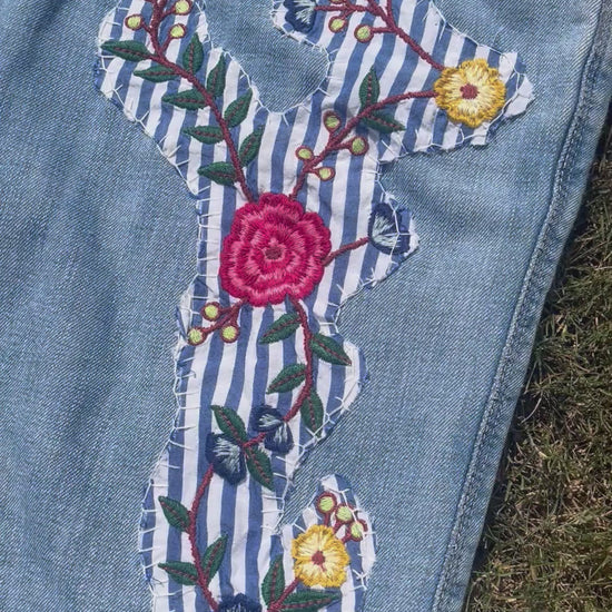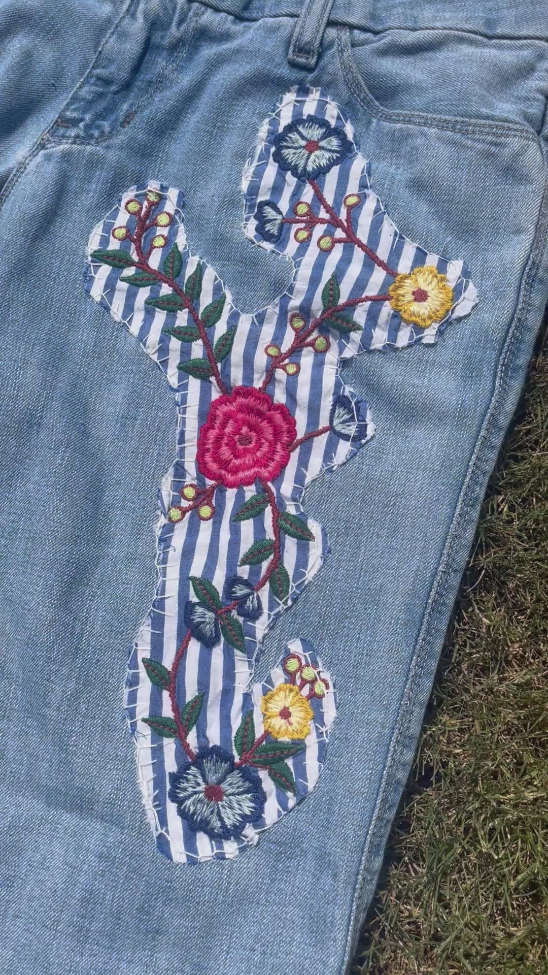 These reworked Ralph Lauren jeans are a true one-of-a-kind statement piece. I transformed them by adding patchwork embroidery across the front, floral embroidery on the back pocket, and bold striped cuffs at the hem. Every detail is sewn by hand, making them completely unique.