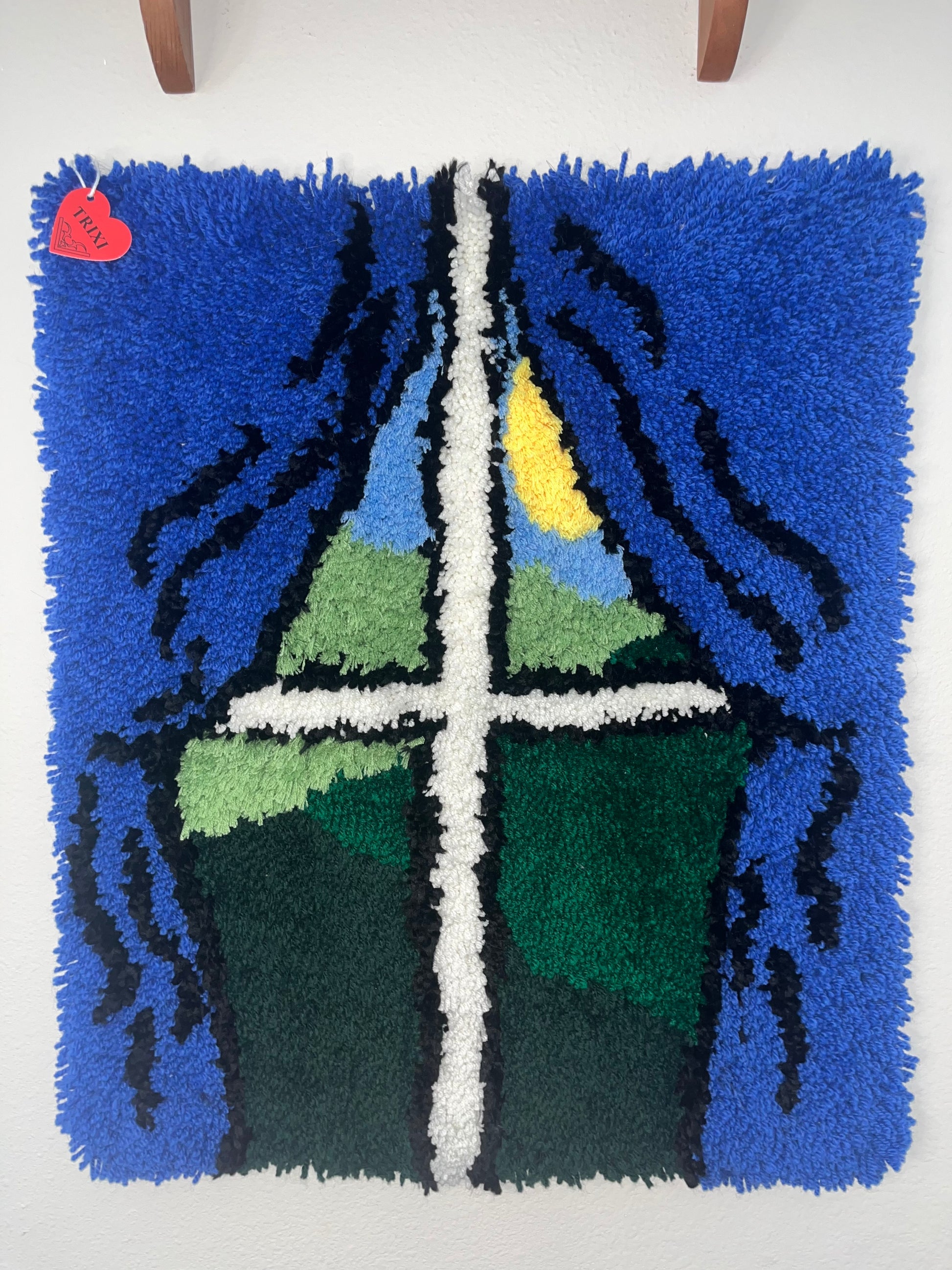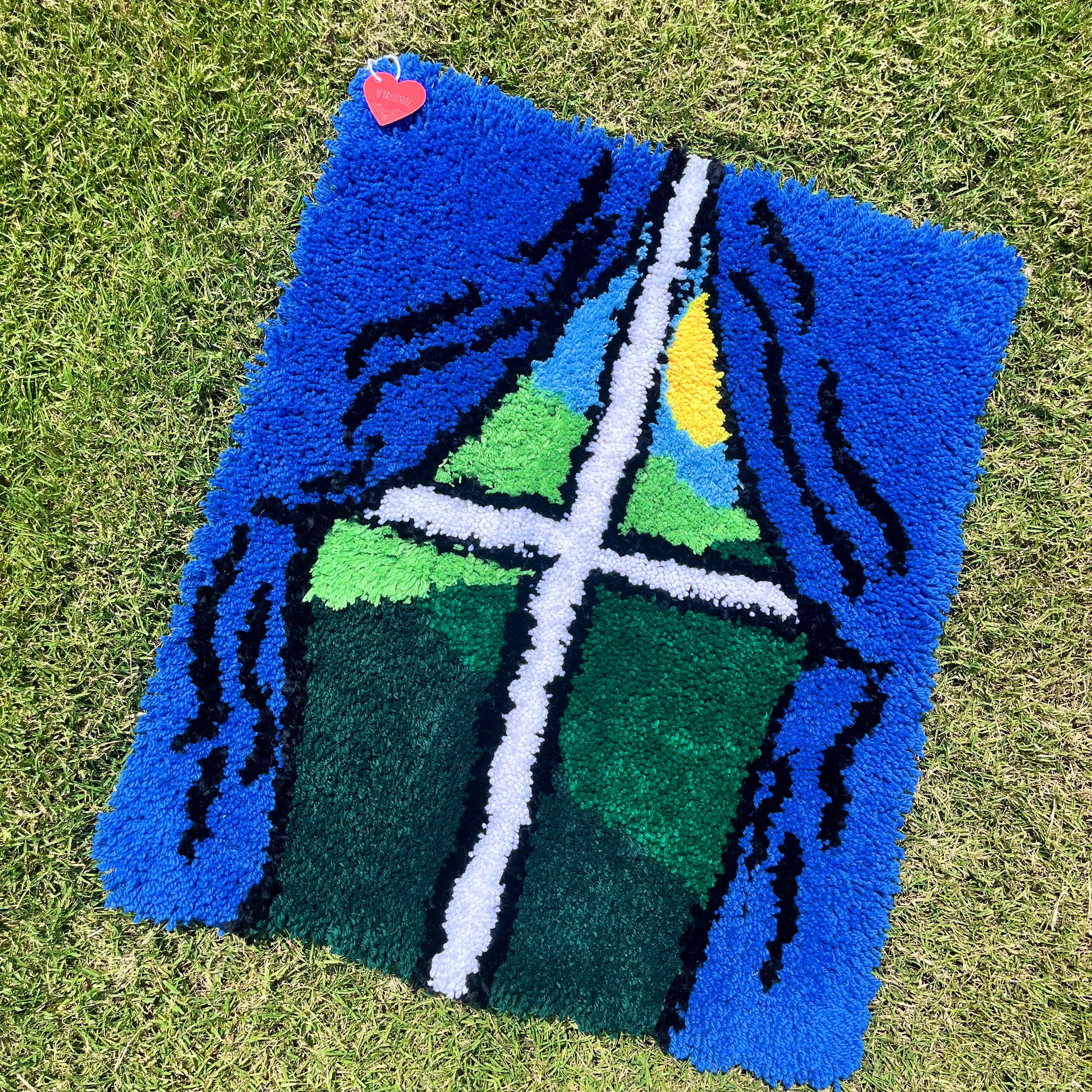 Bring cozy charm and creativity into your space with this one-of-a-kind handmade tufted rug. Designed to look like a colorful window scene, it features lush green hills, a glowing sun, and flowing blue curtains against a vibrant sky.